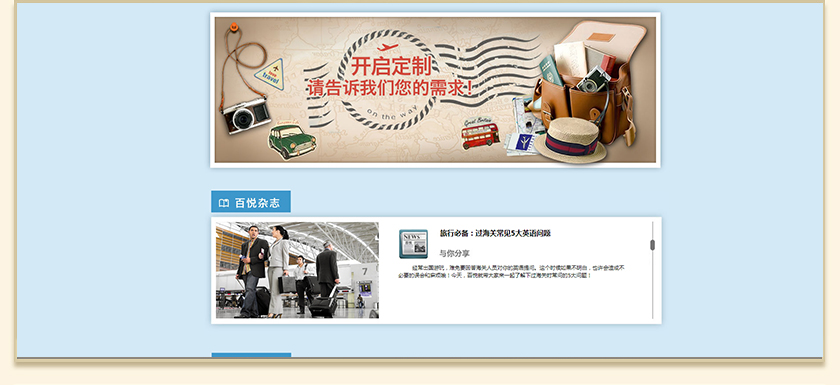 Project Description 百悦逸游于2012年初由二位资深的旅行家创办,是成都传媒集团旗下成都新闻国际旅行社有限公司的高端旅游品牌,总部位于成都高新区天府大道中段美年广场。在百悦逸游成立之前,创始团队亲自到全球三十多个国家实地考察,带着第一手的资讯和执着的信念创立了中国西部第一家真正意义上的私人定制旅行机构。百悦的旅行不是跟团挤大巴,不是十天去十个国家,更不是没完没了的... Official website address 眉山http://www.100.travel I want to share